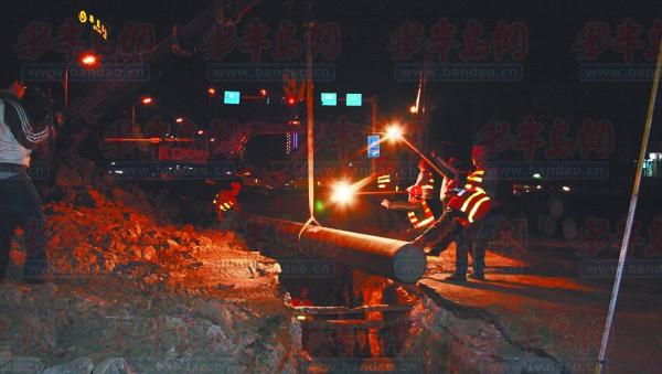 工作人員夜間鋪設(shè)供水管道。